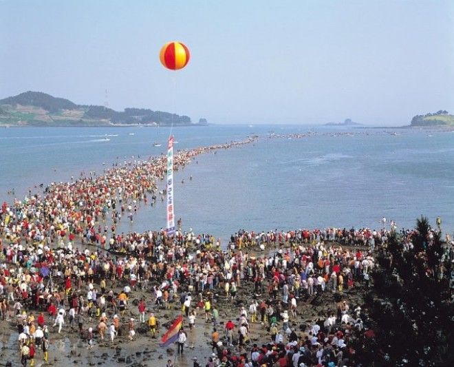 Дважды в год возле острова Чиндо происходит уникальное природное явление, напоминающее библейскую историю, когда Красное море расступилось перед Моисеем: между районом Когун-мён Хведон-ни и Ыйсин-мён Модо-ри расступается морская вода и на час открывается дорога шириной 40 метров и протяжённостью 2,8 км, соединяющая острова Чиндо и Модо. Ученые считают, что «разделение моря» появляется на острове Чиндо из-за разницы приливов и отливов, а время его пика зависит от лунных циклов. Неудивительно, что тысячи туристов устремляются в Южную Корею чтобы стать свидетелями настолько невероятного явления природы. В течение часа местные жители и туристы, многие из которых ассоциируют это явление с библейской притчей о расступившихся перед Моисеем водах Красного моря, гуляют по открывшейся суше и собирают попавшие в эту ловушку морские деликатесы. Чиндо – это провинция Чолла-Намдо, где проходит Таинственный Морской Путь. В день открытия морского пути тысячи туристов заполнят 2,3-километровый путь. Самые сильные морские отливы в этих краях можно наблюдать в конце осени и зимой, однако большинство туристов приезжают на Чиндо в начале мая, чтобы не только увидеть “чудо Моисея”, но и с удовольствием прогуляться по “морской дороге” в теплую погоду. Феномен разделения моря стал всемирно известен после того, как французский посол в Корее Пьер Ранди посетил Чиндо в 1975 году и написал об этом во французской газете. Но самое главное действо — это шествие по воде. По этому «Моисееву пути» можно пройти от материка до острова. Несмотря на научное обьяснение данного явления, в Корее существует древняя легенда. Некий Сон Дон Чжин был осуждён и отправлен в ссылку на остров Чечжудо. По дороге его корабль во время шторма потерпел крушение. Но сам Сон вместе со своей семьёй и командой спасся, доплыв до ближайшего острова Чиндо. Место, на котором он оказался, называлось Хведон (деревня тигров), потому что там водилось много полосатых хищников. Потомки Сона прожили на острове более 200 лет и всё это время регулярно подвергались нападению тигров. Тогда они решили переселиться на соседний остров Модо. Однако во время переезда они забыли в деревне одну старушку. Старушка осталась в одиночестве, и стала молить морского Дракона чтобы он помог ей воссоединиться с семьёй. Дракон явился ей и приказал прийти на берег моря. Оно расступилось и женщина двинулась в путь, но, потеряв силы, упала. Тогда семья пересекла море с другой стороны и забрала её. Перед смертью бабушка поблагодарила Дракона за то, что он воссоединил её с близкими. С тех пор на острове Чиндо люди ежегодно проводят церемонию в память о старушке и о чуде которое сотворил Дракон. А бабушке и тигру поставили памятник на месте её перехода через море. Через несколько часов море возвращается, и прогулка по воде становится невозможной. Если туристы зазевались и не успели добраться до суши когда море начинает возвращаться — не беда. Многочисленные лодки и полицейские окажут помощь и доставят на берег. | |